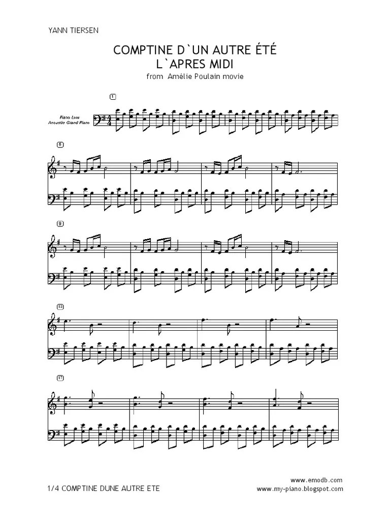 Laden sie die noten für klavier von comptine d'un autre été : Bei noviscore steht jeder titel in mehreren versionen mit verschiedenen niveaus zum notendownload bereit. Transcribed by ian chard mp. Laden sie kostenlos unsere beispielversionen des . Click read more to download sheet music pdf. Die lange version ist eine eigene komposition. Setliste kreieren · der kauf beinhaltet einen ausdruck plus · interaktive noten · pdf der offiziellen verlagsausgabe · zugang von jedem gerät, auch von der gratis . Die noten dafür bekommst du auf der facebookseite des komponisten thechiefemperor:: . Help us keep this site free for everyone. Contains printable sheet music pdf format.